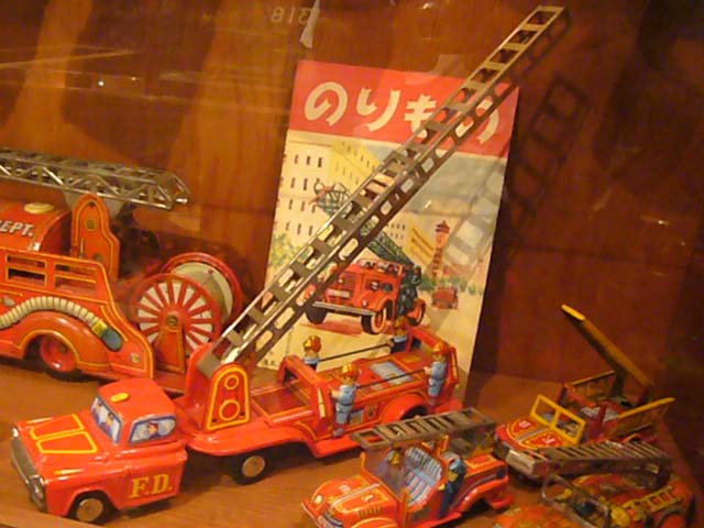 手にとって遊ぶことはできない展示品だが、上の子が好きな「消防車」のおもちゃの前では大はしゃぎ。