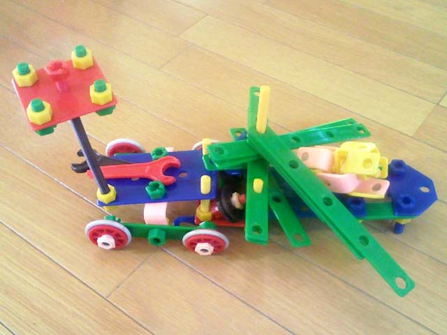 普段遊んでいるレゴと違うので、最初は組み立て方に戸惑っていたが、すぐに慣れて…わけのわからない形を作り出す。