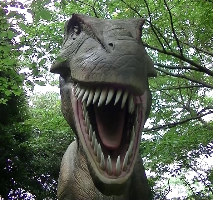 森の中に、恐竜のロボットが置いてあります。