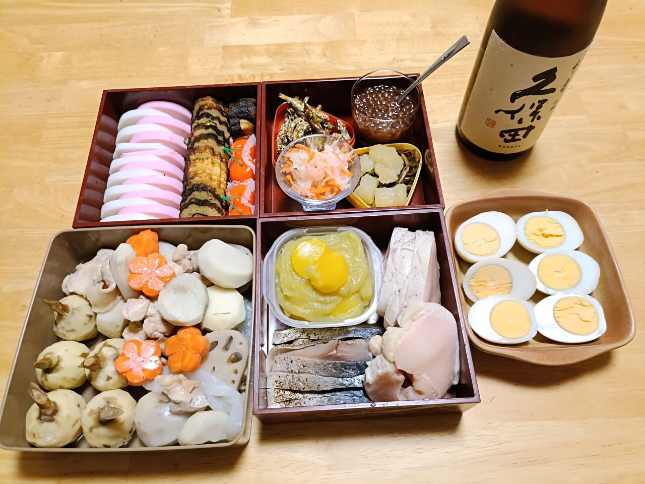 左上の一の重、紅白かまぼこと、さくらんぼの練り切りは市販品。伊達巻は僕の作ったもの。